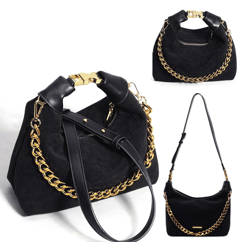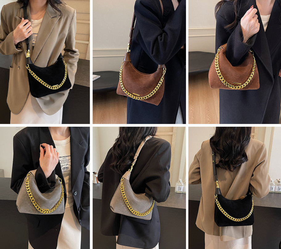 Элегантная коричневая сумка из замши с золотистой цепочкой.