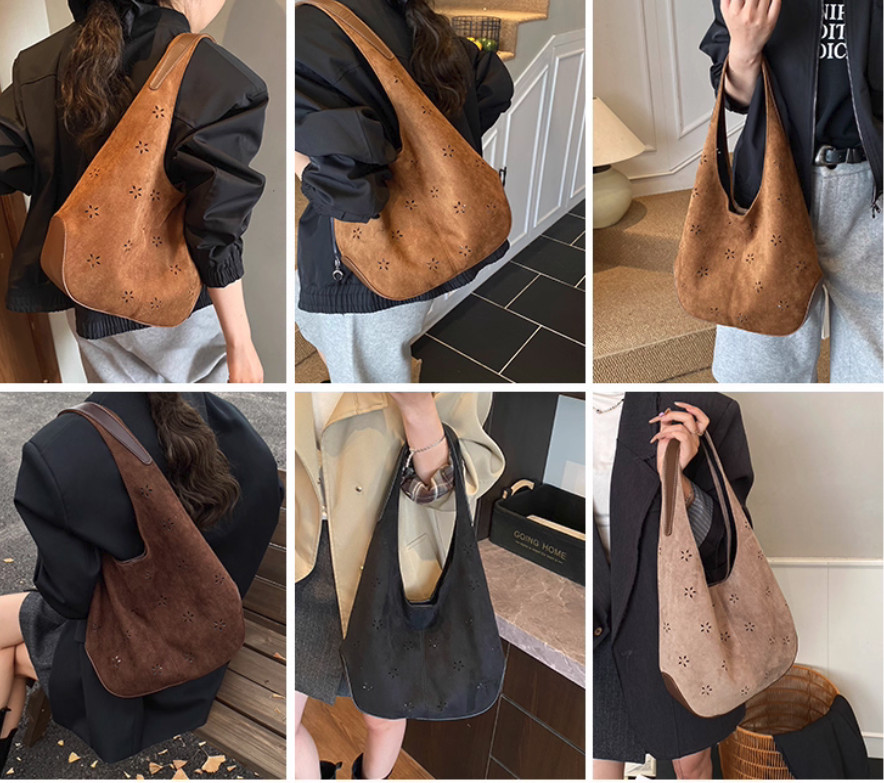 Коричневая сумка-хобо с лазерной перфорацией в виде цветочков.