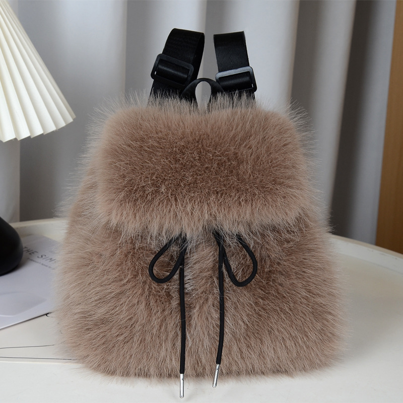 Рюкзак из мягкого пушистого материала ( искусственный мех)  с клапаном и шнуровкой на завязках.