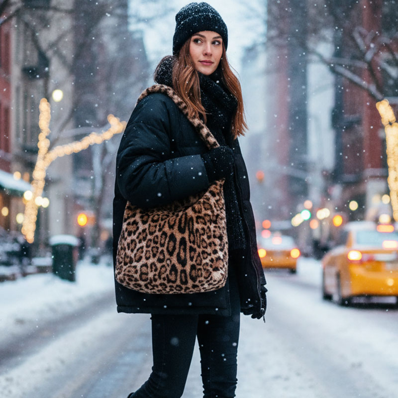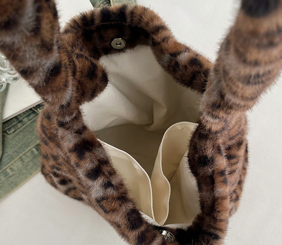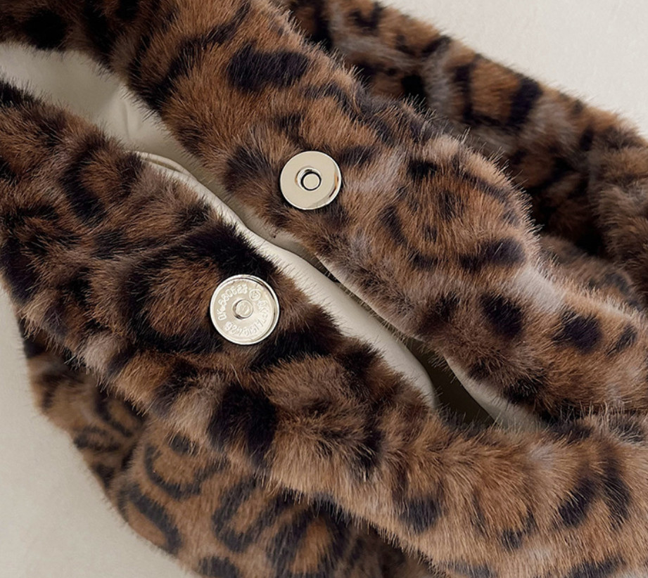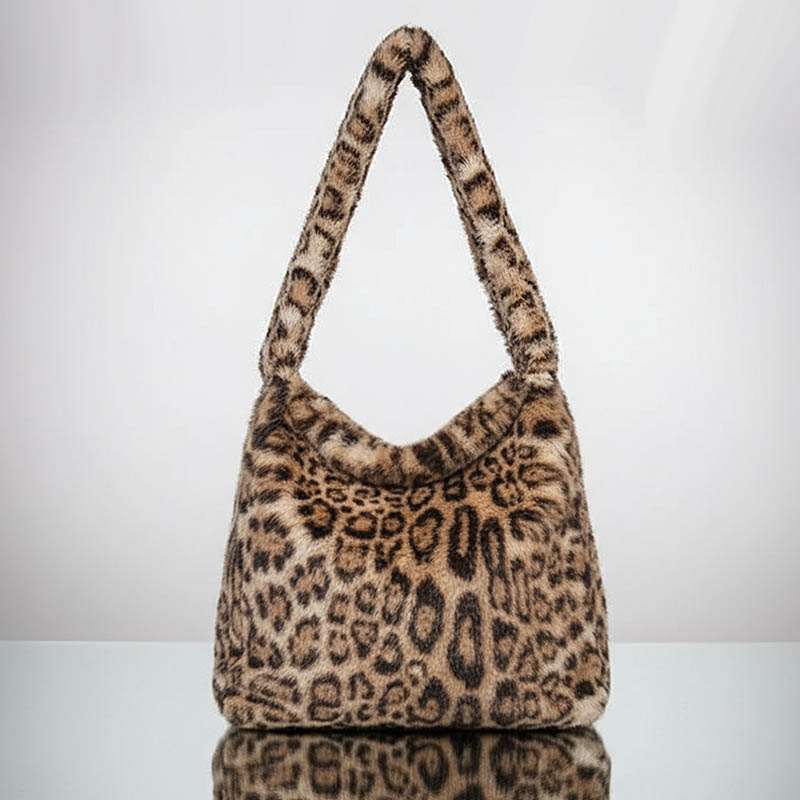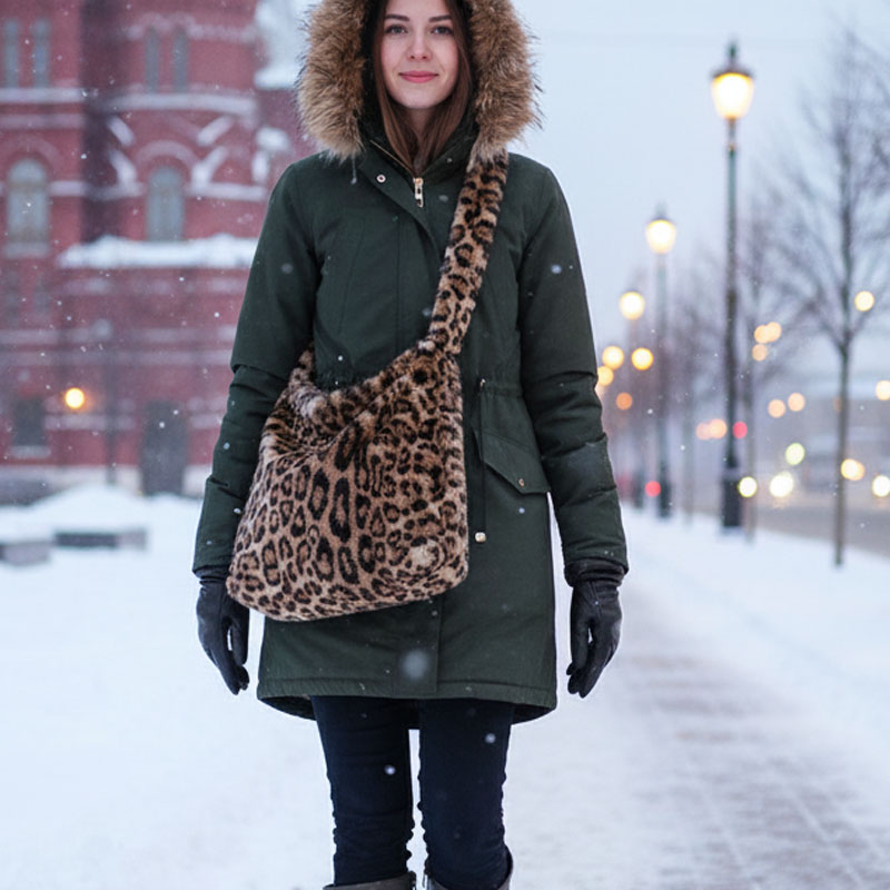 Стильная женская сумка из мягкого искусственного меха с эффектным анималистическим узором.