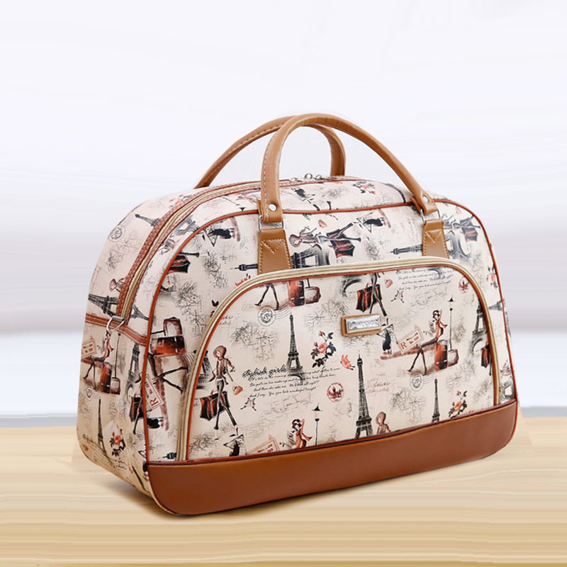 Стильная дорожная сумка из прочной экокожи с ярким декоративным принтом.