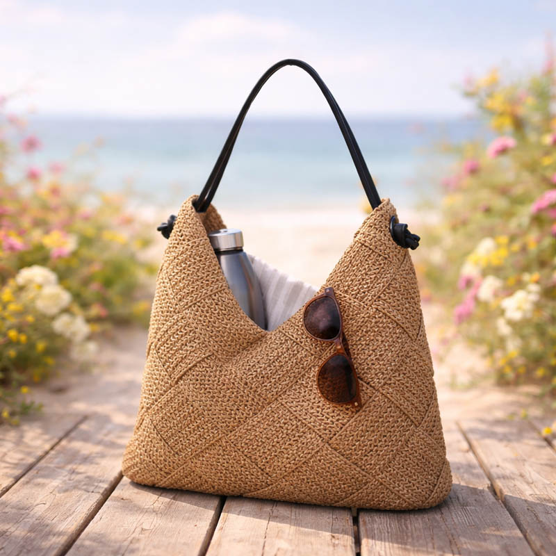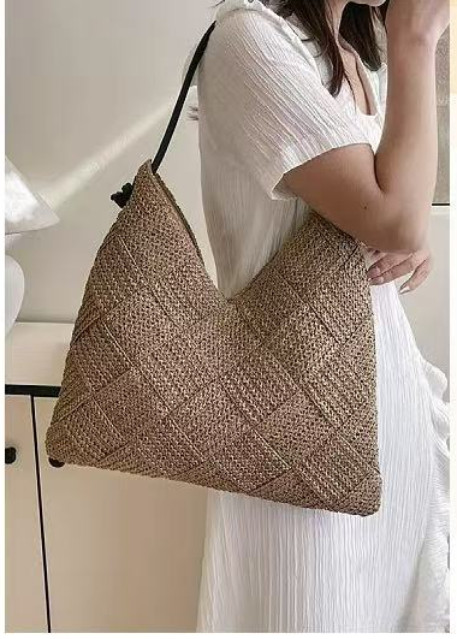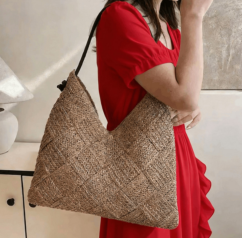 Стильная плетёная сумка с мягкой формой и выразительной фактурой.